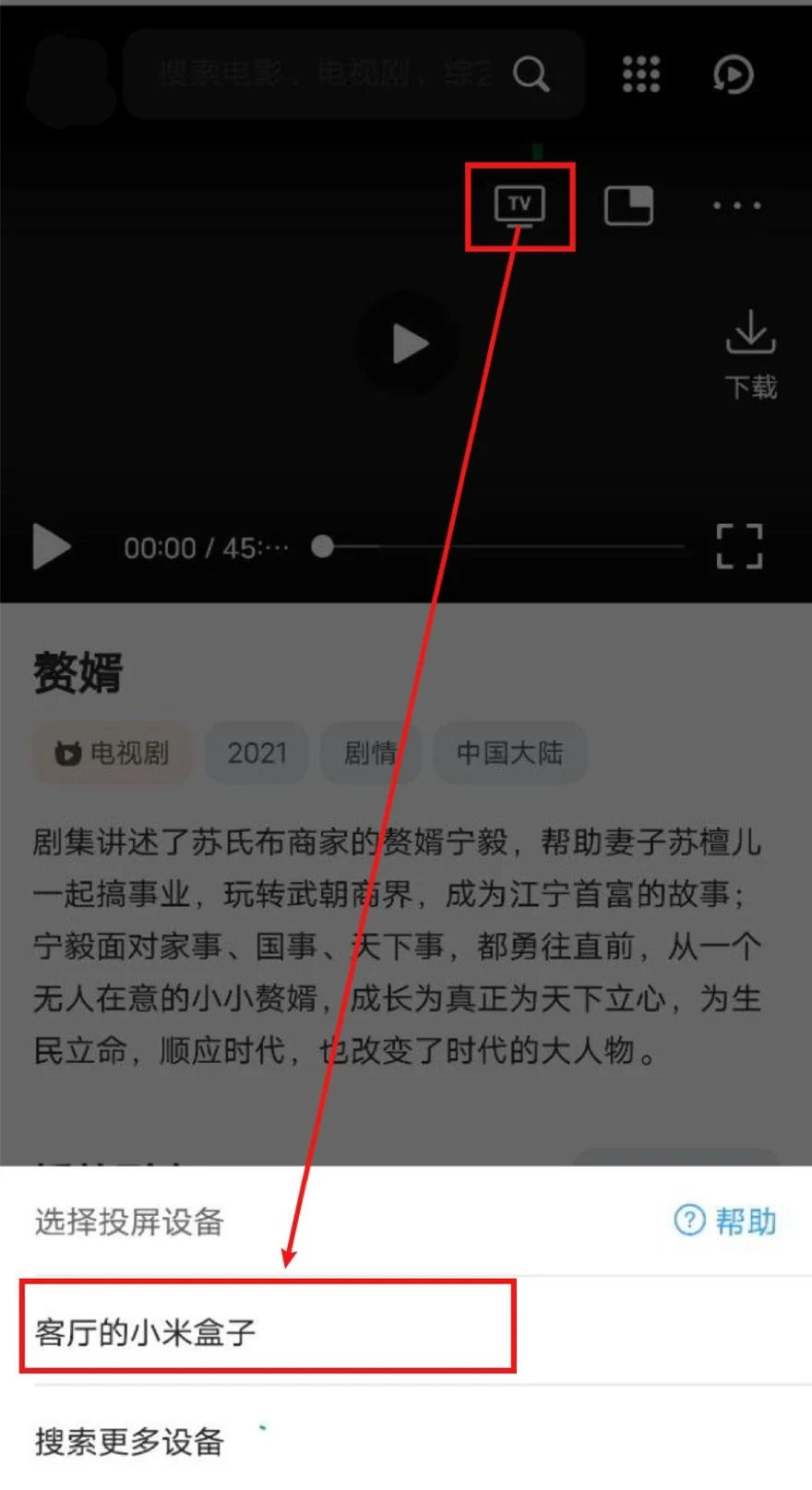 打开QQ浏览器(会接管网页播放器)->打开免费视频分享大全 - xdy5151->播放视频->选中投屏图标->等待搜寻出智能电视/电视盒子->选中,即可投屏。